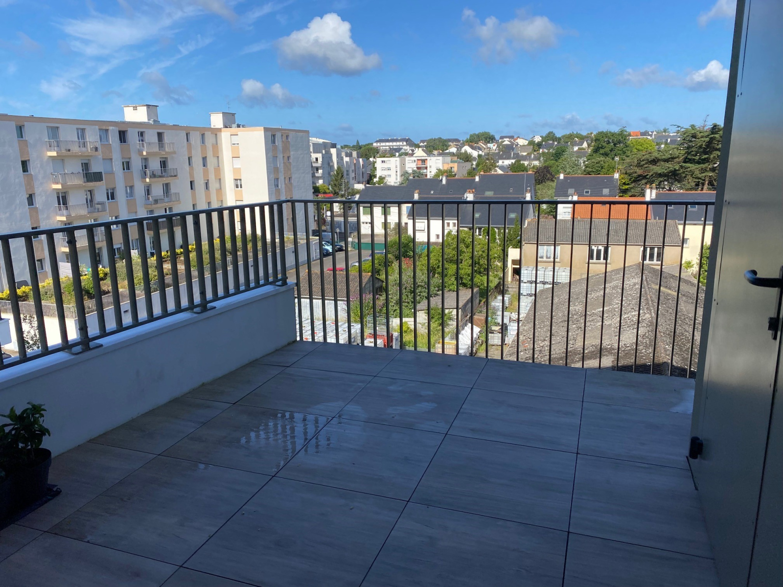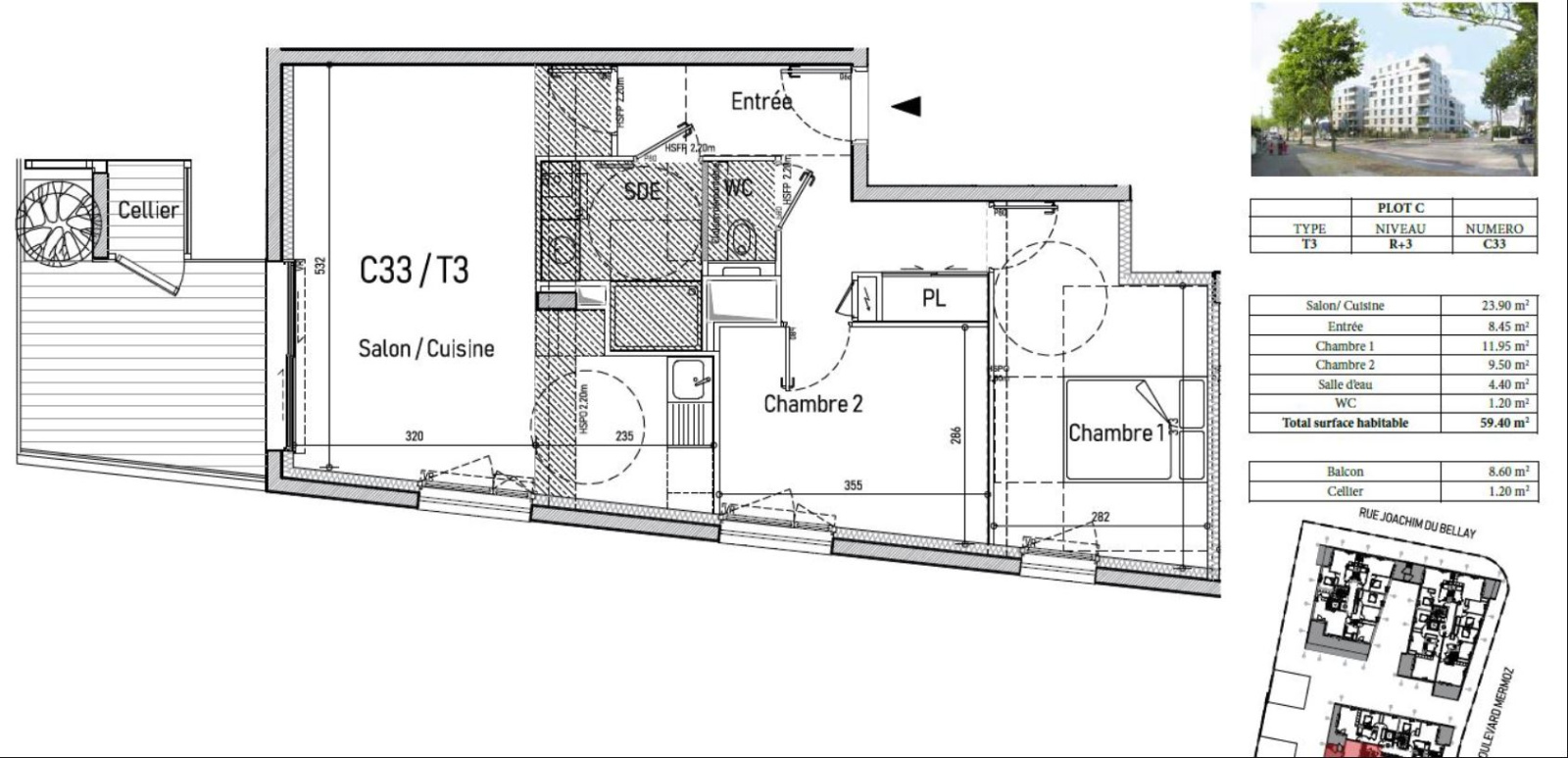 A Saint-Nazaire dans résidence neuve LE MERMOZ, appartement neuf T3 C33 d'une superficie de 59,40 m² situé au 3ème étage avec ascenseur composé : Entrée avec placard, séjour avec cuisine aménagée et équipée (plaques de cuisson) donnant sur balcon de 8.60 m² exposé OUEST, 2 chambres, salle d'eau, WC séparé. Garage N°43.