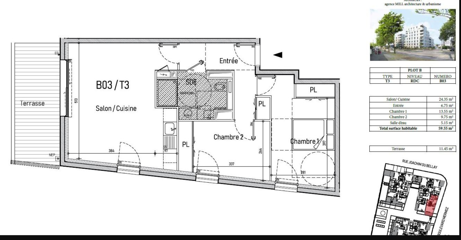 A Saint-Nazaire dans la résidence LE MERMOZ, appartement T3 B03 d'une superficie de 59,55 m² situé au R.D.C avec terrasse privative de 11.45 m² composé : Entrée avec placard, séjour exposé SUD avec coin cuisine, 2 chambres, salle d'eau avec WC. Garage N°21.