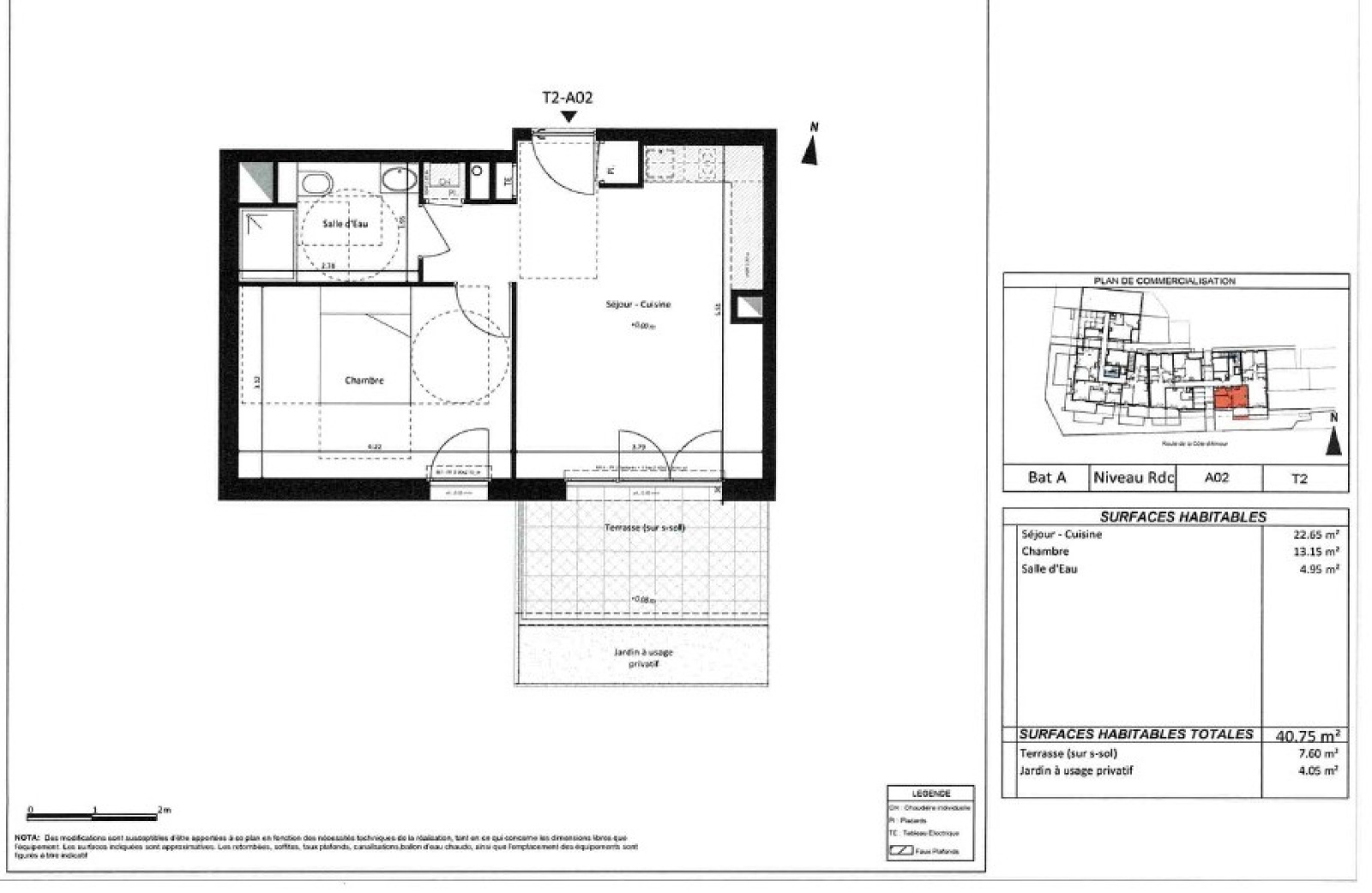 Route de la Côte d'Amour, beau T2 A-02 situé en Rez-de-Jardin d'une superficie de 40.75 m² composé : entrée avec placard , séjour avec coin cuisine équipée d'un petit frigo, hotte et plaques de cuisson de 22.65 m² donnant sur terrasse privative de 7.60 m², 1 chambre de 13.15 m², salle d'eau avec WC. 1 Place de parking privative P01 . Appartement soumis à la LOI PINEL.