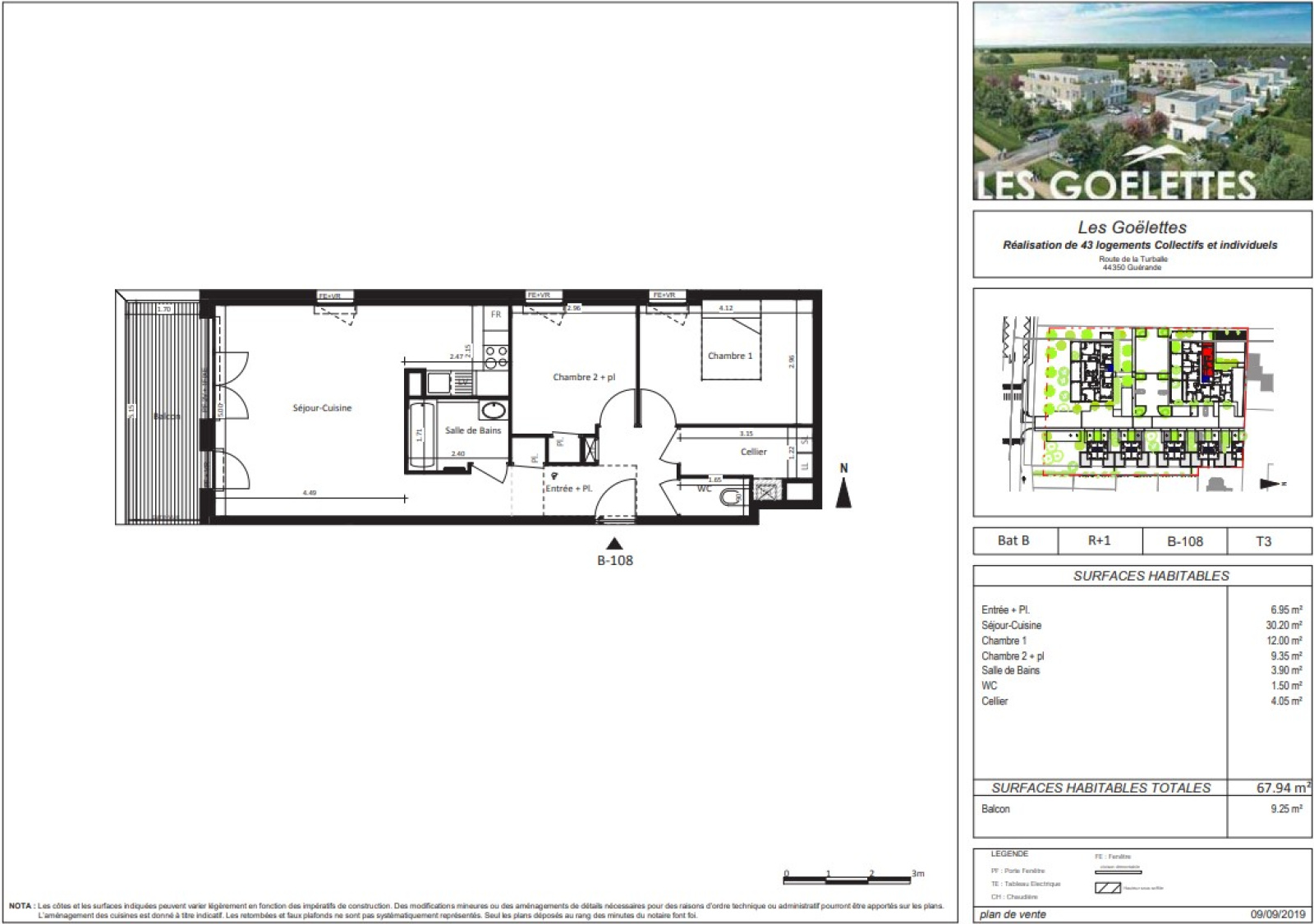 T3 d'une superficie de 67.94 m² situé au 1er étage, composé : entrée avec placard, cuisine ouverte aménagée et équipée (hotte, plaques de cuisson) sur pièce à vivre de 30,20 m² avec balcon de 9.25 m², 2 chambres dont 1 avec placard (9.35 m² et 12 m²), salle de bains, WC séparé. Cellier. LOI PINEL