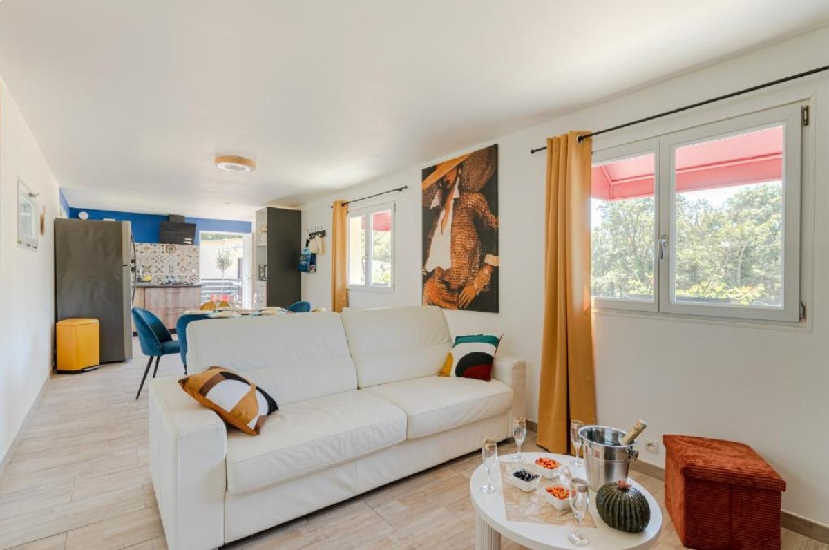 Dans un cadre arboré, au coeur d'un gîte équestre, bel appartement T2 indépendant entièrement meublé d'une superficie de 50 m² composé : grande pièce à vivre (avec canapé convertible) et coin cuisine aménagée et équipée (four, plaques Gaz, frigo-congélateur, lave-vaisselle, four micro-onde, hotte, lave-linge), 1 chambre (1 lit 140 cm + 1 lit 90 cm) avec salle d'eau et WC.