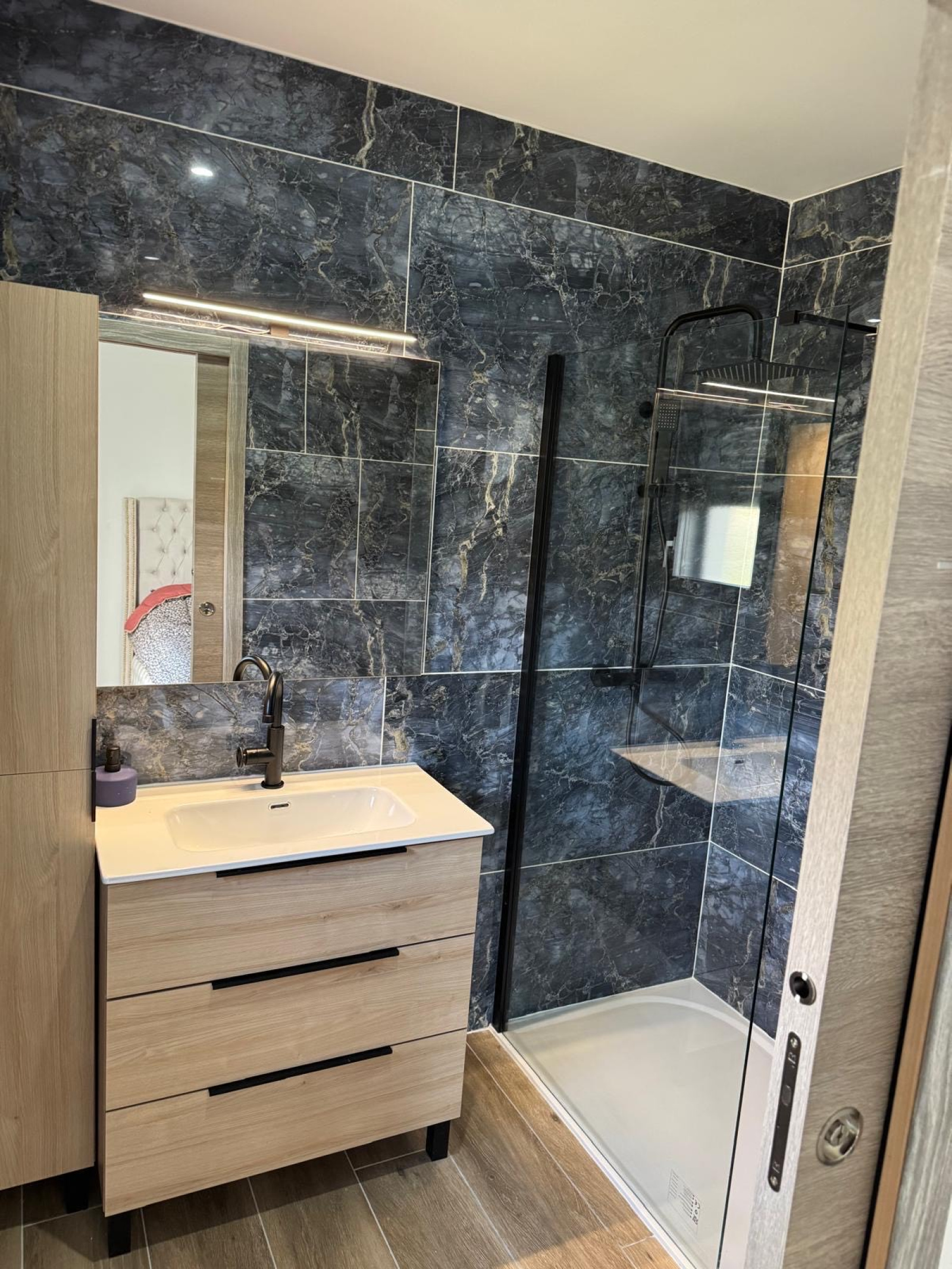 Au rez de chaussée : une pièce de vie de 52.86 m² comprenant un salon-séjour, une cuisine aménagée équipée (plaques, four, hotte), une suite parentale de 12 m² avec sa salle d'eau privative et un WC séparé. Une buanderie et un garage de 16.91 m².
