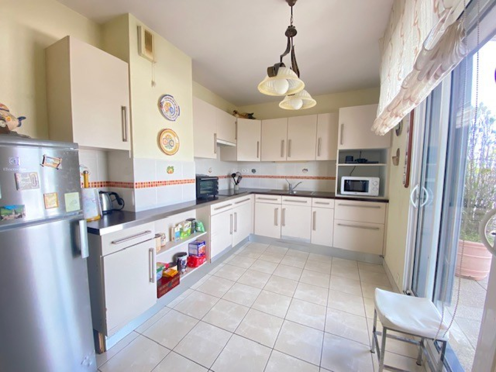 Appartement 3 pièces de 74 m² au dernier étage avec ascenseur, composé : une entrée avec placard desservant une pièce à vivre avec accès sur la terrasse SUD-EST, une cuisine aménagée et équipée avec accès direct à la terrasse, un dégagement desservant un wc, une salle d'eau (douche italienne et emplacement L.L), deux chambres dont une avec dressing.