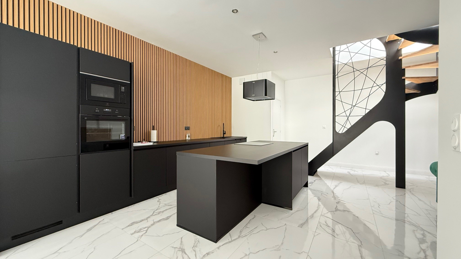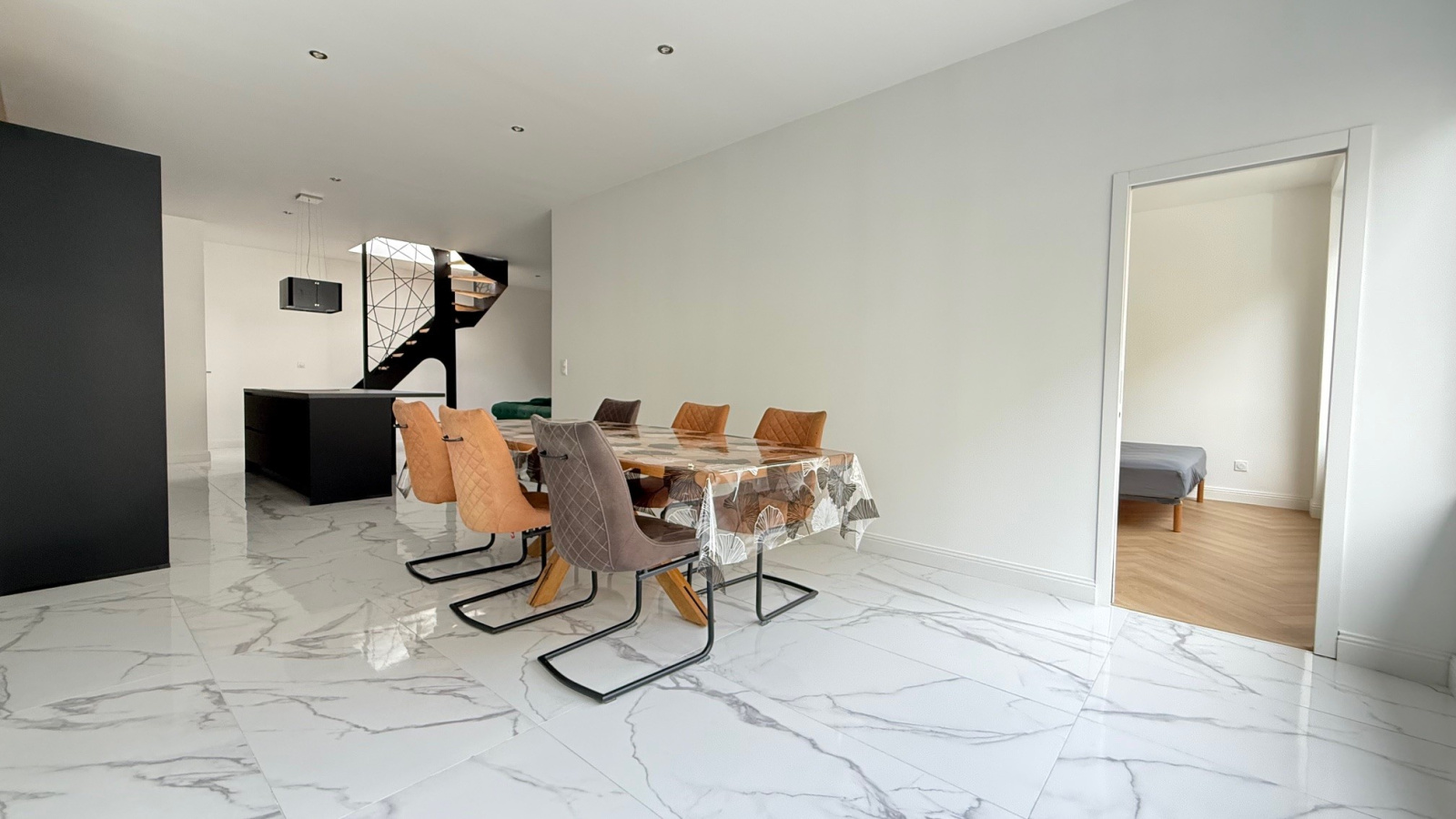 Loft entièrement rénové composé d' une entrée , un toilette, une pièce de vie de 68 m2 avec cuisine aménagée et équipée , une suite parentable avec un coin dressing et une salle d eau , deux chambres et une salle de bains avec douche et baignoire