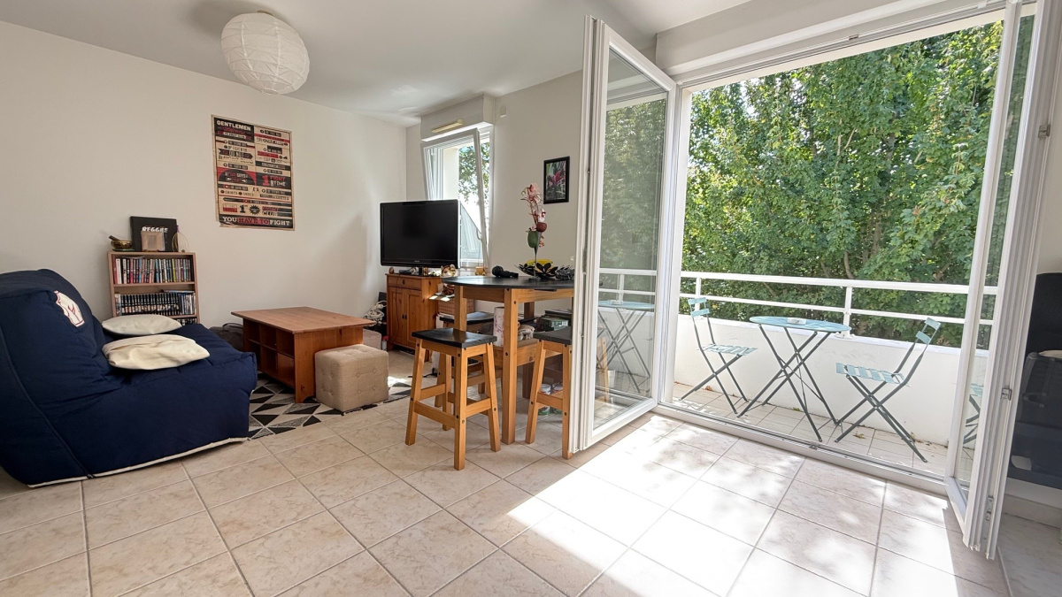 Appartement T2 au 1er étage et dernier étage d'une petite copropriété récente, offrant : une cuisine ouverte sur la pièce de vie, 1 chambre, salle d'eau. Balcon exposé SUD-OUEST.