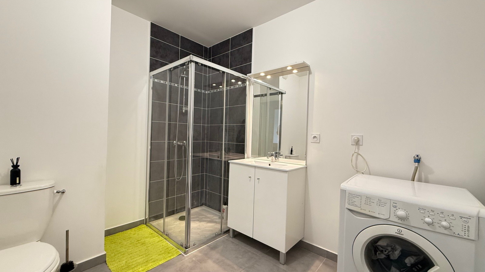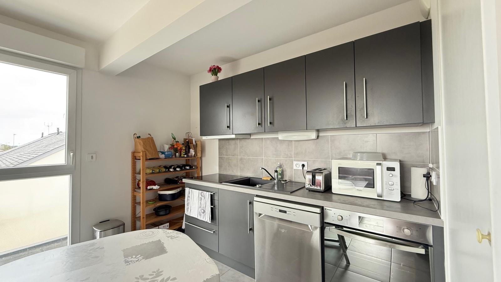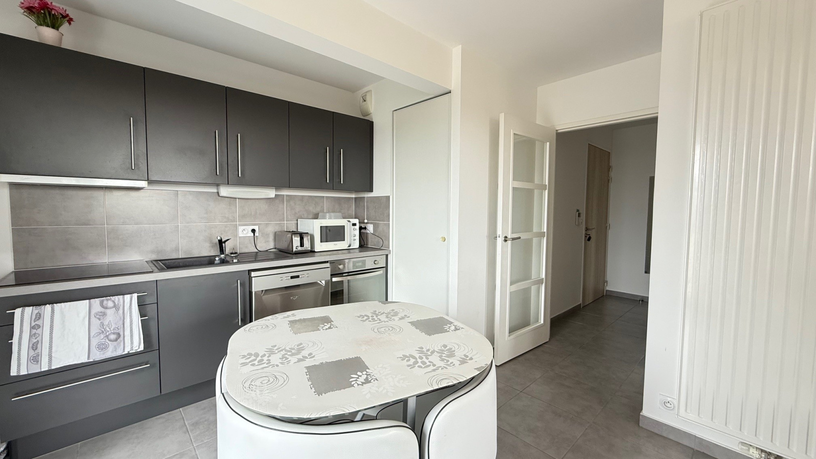 Une entrée avec placard, séjour avec cuisine aménagée et équipée (plaques, hotte, four) donnant sur balcon exposé SUD-OUEST avec vue dégagée et sans vis à vis, 2 chambres dont une avec placard, salle de douche avec wc (douche à l'italienne, vasque et emplacement lave linge).